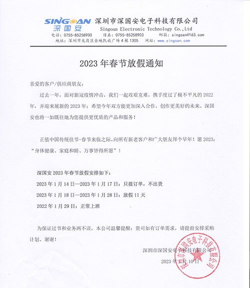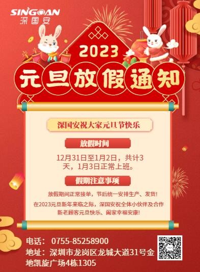 深國安2023年春節(jié)放假安排如下:放假時間:2023年1月18日-2023年1月28日,共放假11天(2023年1月29日初八正常上班)(放假期間正常接單,統(tǒng)一年后安排生產(chǎn)與發(fā)貨!)正值春節(jié)來臨...