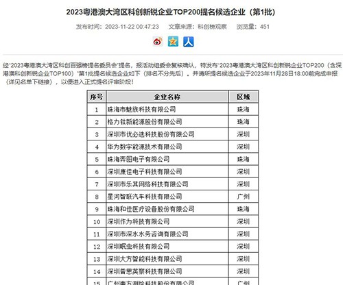 重磅消息!熱烈祝賀深國安入選2023粵港澳大灣區(qū)科創(chuàng)新銳企業(yè)TOP200第一批提名候選企業(yè),排在第86位,一同入圍的還有華為、優(yōu)必選、魅族等企業(yè)。