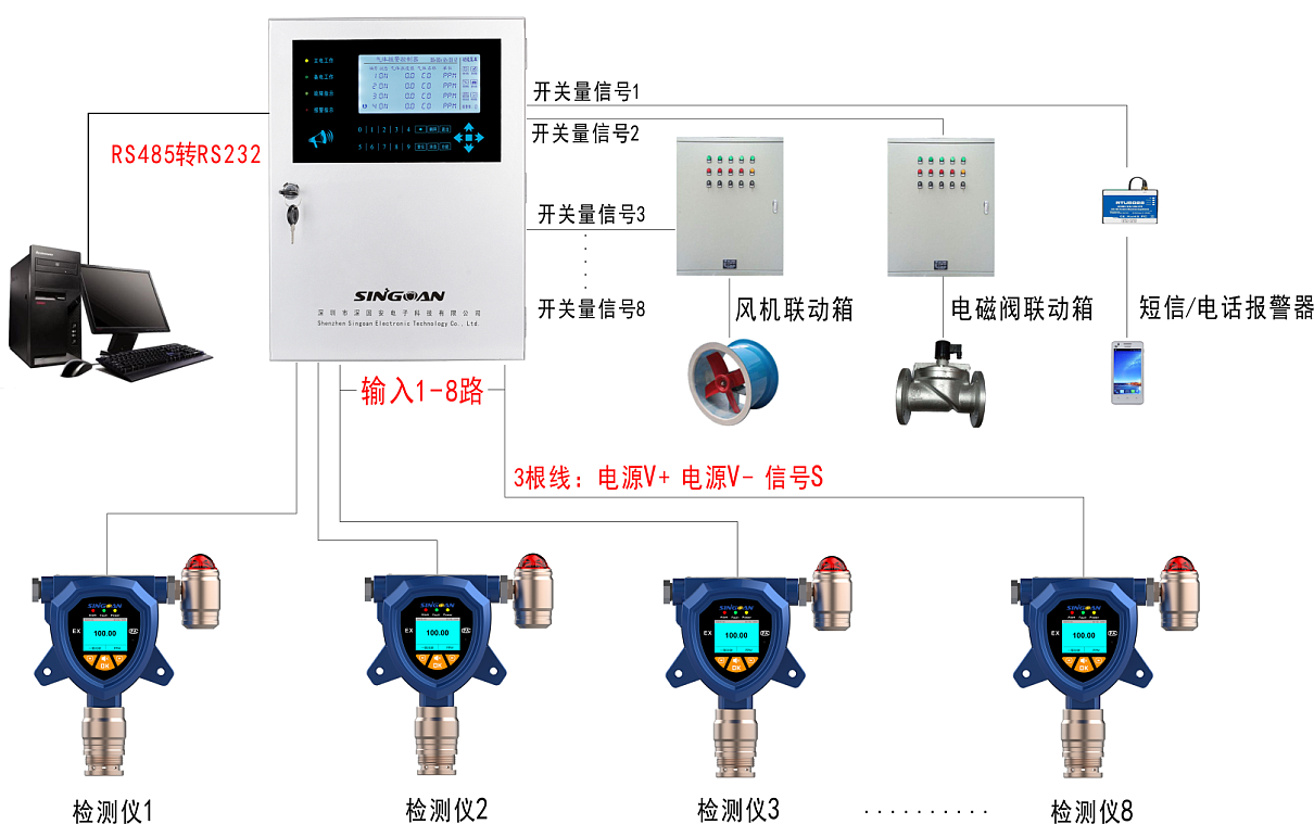 6)自帶8組繼電器開關(guān)量信號,可同時與多組電磁閥、風(fēng)機等進行聯(lián)動;