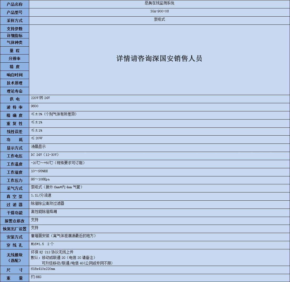 SGA-900-OU惡臭在線監(jiān)測系統(tǒng)由供電單位、采樣單元、樣氣過濾單元、傳感器檢測單元、數(shù)據(jù)處理單元、顯示單元和傳輸單位組成。可同時監(jiān)測包括惡臭在內(nèi)的六種氣體、外加PM2.5、PM10、溫度、濕度共十個參數(shù)指標;工業(yè)級高精觸摸屏,完美顯示當(dāng)前濃度值、最大值、最小值、1分種和1小時平均值,并可選取任意時間段時間歷史數(shù)據(jù)查詢,曲線顯示;內(nèi)置大容量存儲芯片,可輕松存儲10萬以上數(shù)據(jù),并通過專用接口數(shù)據(jù)導(dǎo)出;深國安專利技術(shù)的預(yù)標定智能型氣體傳感器,即插即用,方便維保、更換;機箱采用戶外專用納米防護涂層技術(shù),耐日曬雨淋、隔熱、防蚊蟲,可在戶外長期使用;兼容TCP、IP、MODBUS 等通信協(xié)議,即可無線數(shù)據(jù)上傳對接當(dāng)?shù)丨h(huán)保局,也可有線遠傳組網(wǎng);