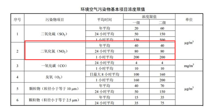 大氣指標中二氧化氮標準限值為:年平均濃度限值為40μg/m3,根據我國環境空氣質量標準GB 3095-2012中規定,環境空氣中的二氧化氮NO2的年平均濃度限值為40μg/m3、24小時...