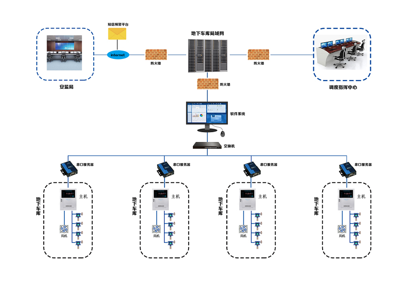3.接著氣體檢測儀監測到一氧化碳氣體時,氣體控制器用于發出報警信號并開啟風機,串口服務器接收控制器發出的報警信號并回傳至軟件系統,軟件系統收到報警信號后,通過地下車庫局域網把報警信息和數據傳輸至安監局和調度指揮中心,安監局通過網絡以短信的方式把一氧化碳監測信息發送到移動平臺。